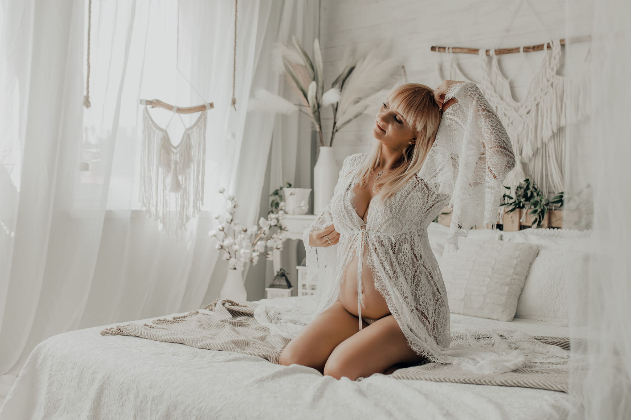 We recommend a bathrobe, a French lace cape with wide sleeves. The bathrobe will be perfect for pregnancy and women's sessions. We also sell other black and red bathrobes.