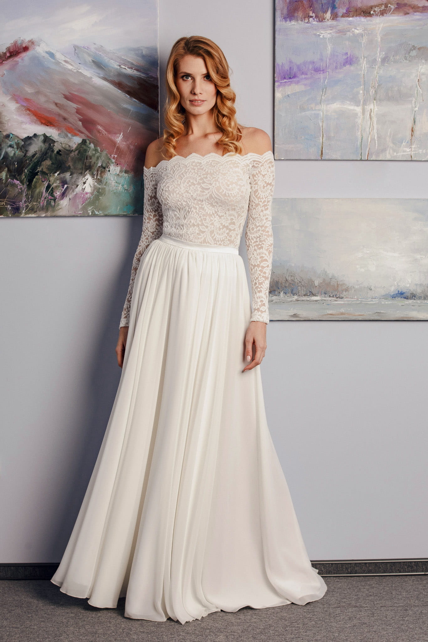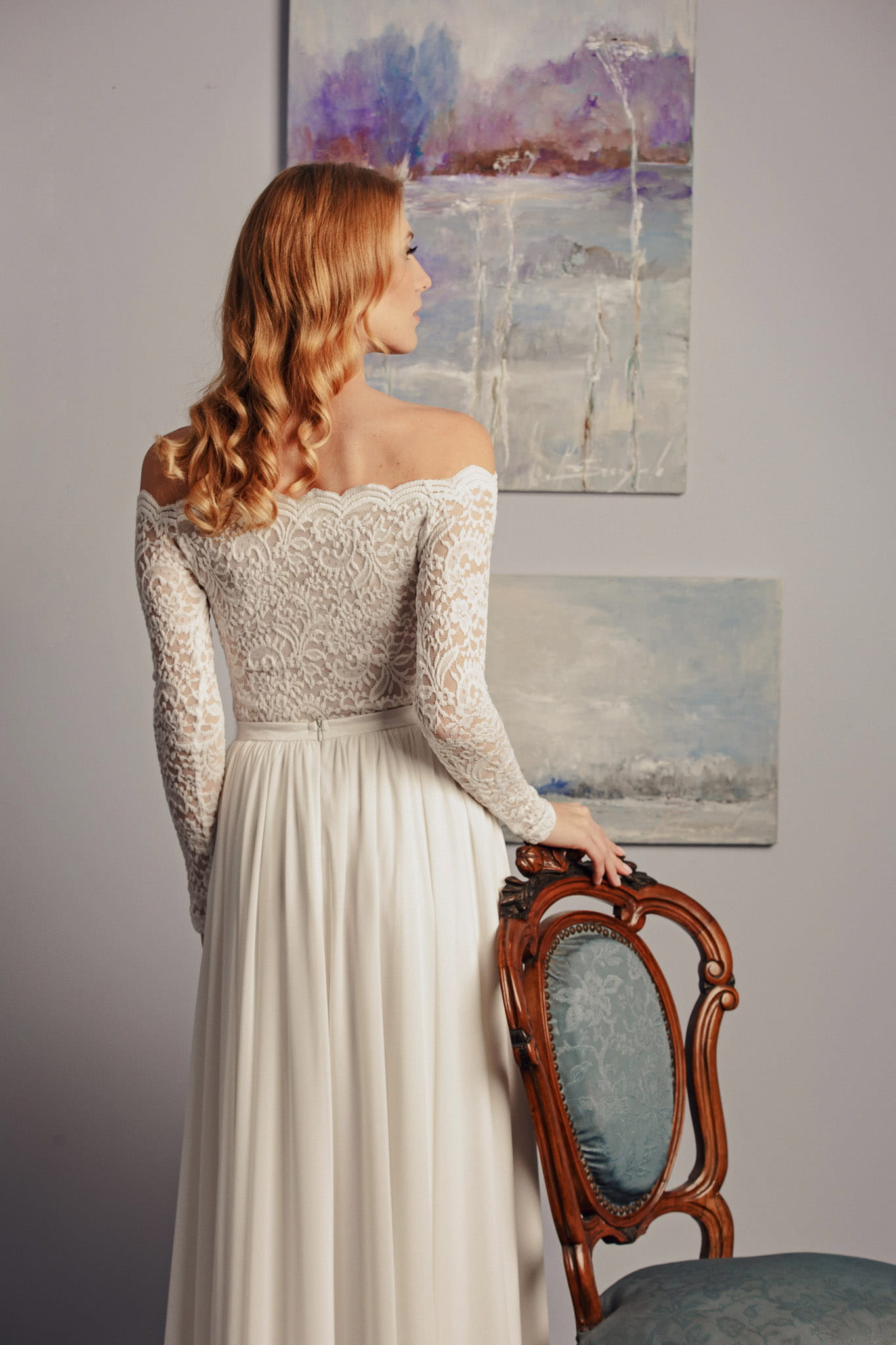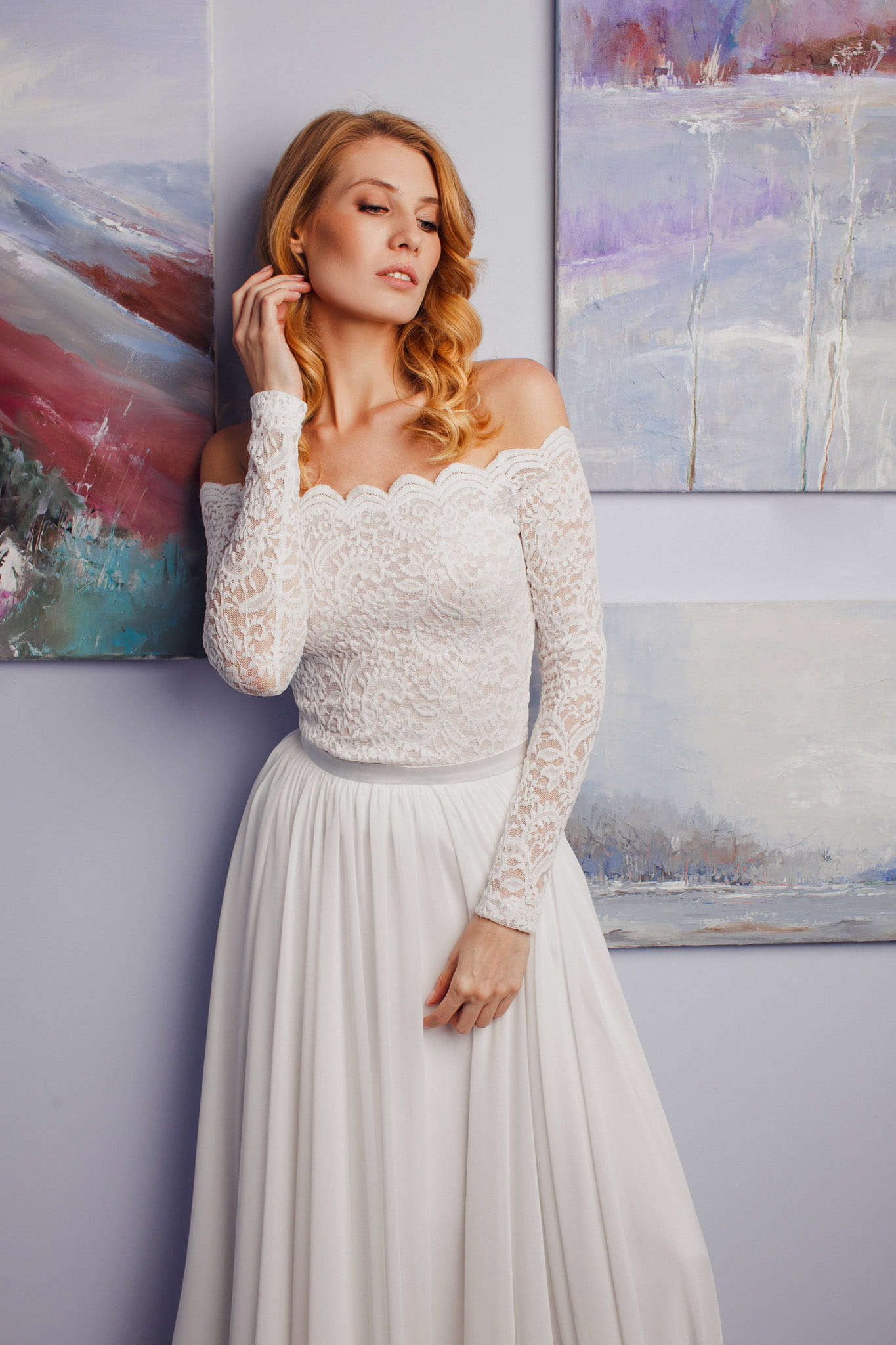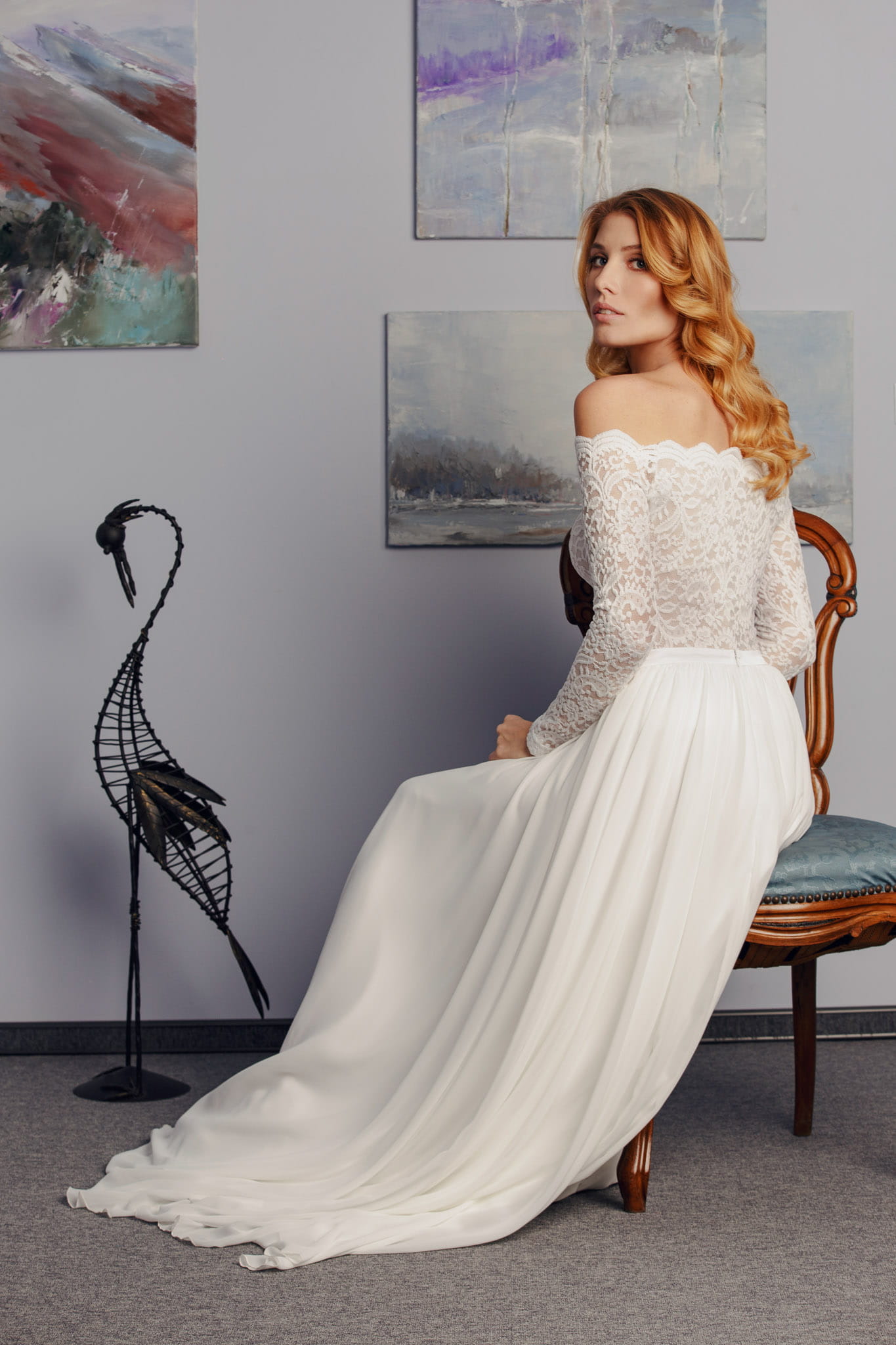 A wedding dress sewn with great care in the color of off-white / cream. Top made of elastic lace with white lining made of elastic mesh, possible lining of the lace with gray or beige mesh. Muslin / chiffon hem. The dress is available in the option of made-to-measure sewing. Possibility to sew a skirt with a cut on the leg.