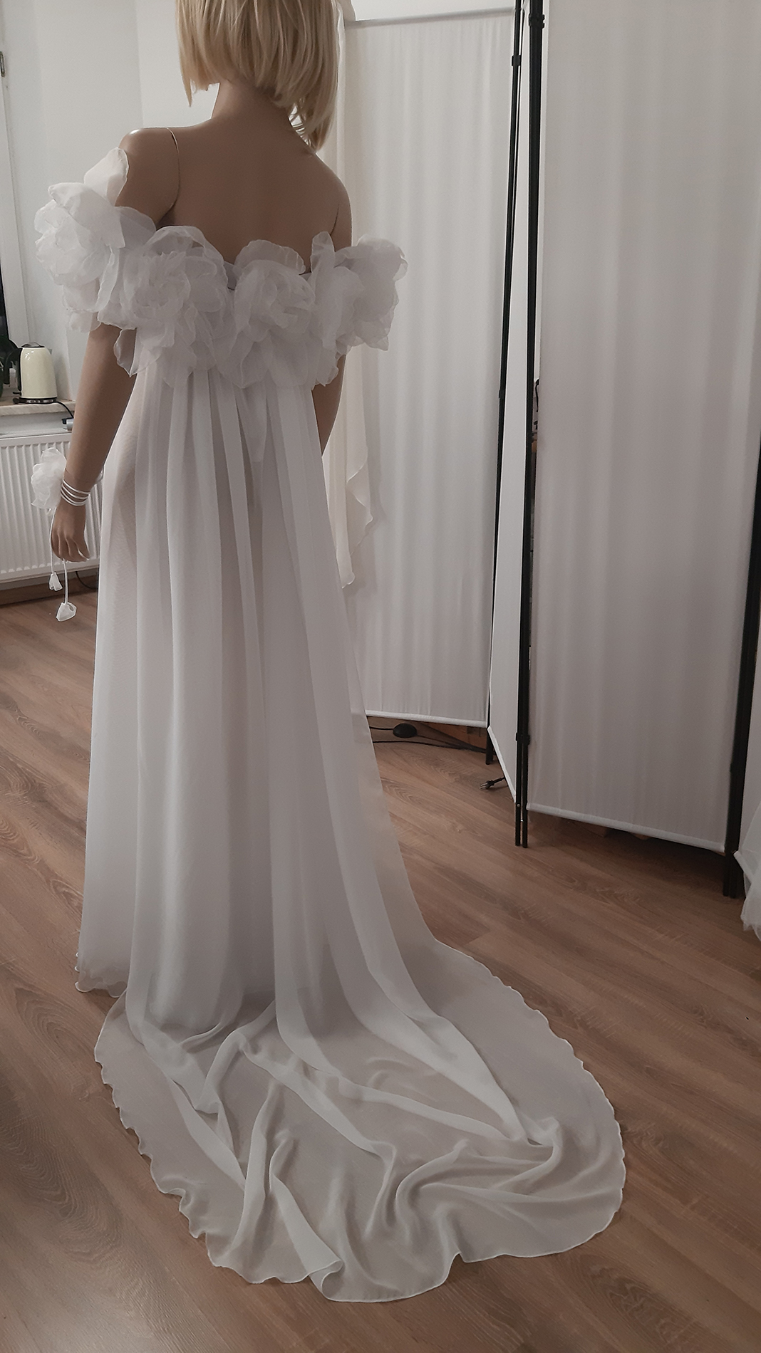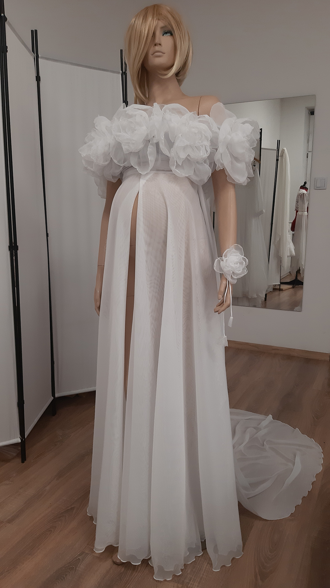 Komplet zawiera top z jerseyu z naszywanymi kwiatami i podwójną, regulowaną spódnicę z trenem z rozcięciem z przodu z mlecznego woalu