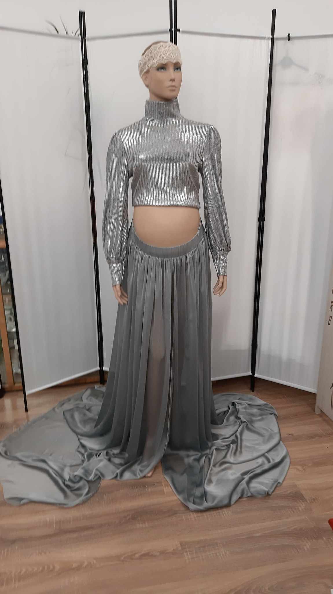 Top, spódnica i ciemne wysokie majtki, kolor Srebrny, rozmiar Uniwersalny